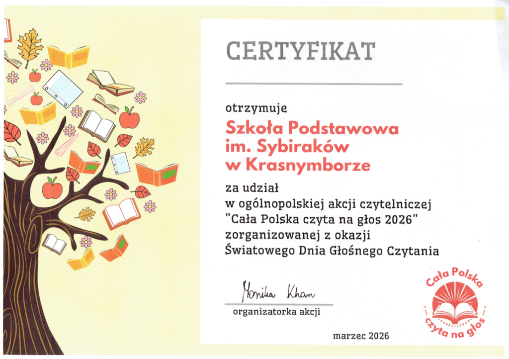 Już po raz dziewiąty 4 lutego 2026 roku jest obchodzony Światowy Dzień Głośnego Czytania. Uczniowie klasy IV Szkoły Podstawowej im. Sybiraków w Krasnymborze – Dawid Paul, Igor Stolarski oraz Paweł Stroczkowski wzięli udział w 5. edycji akcji „Cała Polska czyta na głos”. Do udziału w akcji zachęciło nas Centrum Edukacji Nauczycieli w Suwałkach.
