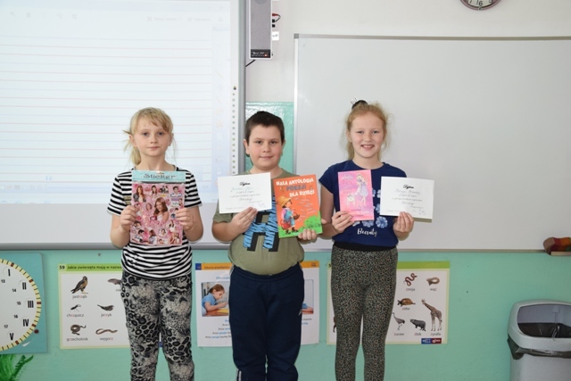 Po długich obradach jury zdecydowało, że: pierwsze miejsce w konkursie zajął: Mateusz Pycz z „0”, Marcel Olszewski z klasy I, Lena Biedul z klasy II i Jakub Pycz z klasy III. Drugie miejsce zajęły: Julia Bagińska z klasy II i Patrycja Piekarska z klasy III, trzecie miejsce zajęli Jakub Skok z „0”, Zuzanna Kuczyńska z klasy I, Antoni Sturgulewski z klasy II. Otrzymali oni nagrody książkowe ufundowane przez Radę Rodziców.